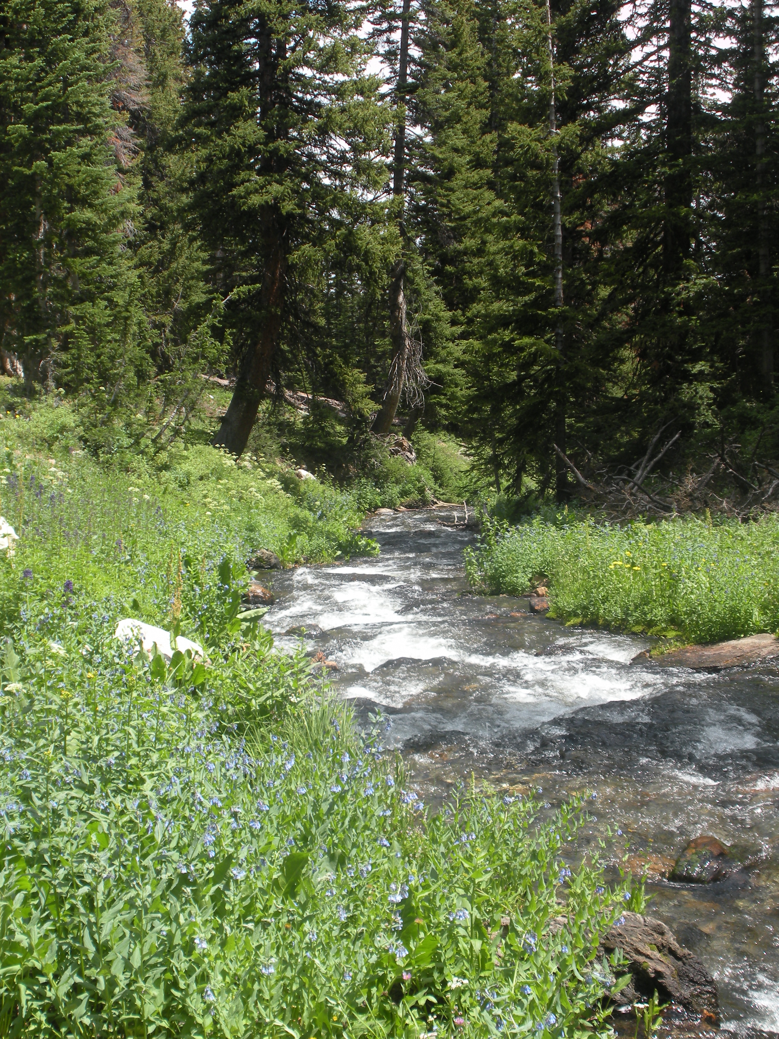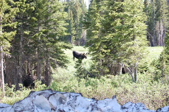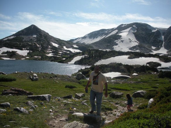 Beyond the one stop travel marts and manicured rest stops is a parallel world of state parks, lonely drives, exciting vistas, and opportunities hard to find when going 70 MPH. To us the best planning involves endless staring at our Rand McNally Road Atlas in search of the possible. Such planning got us first to Curt Gowdy State Park (in time to catch a blue grass festival) and then on top the snowy mountain range to camp at beautiful Lake Marie (elevation high enough for year round snow, maybe +9.000’). We spied moose, hiked around the alpine wonderland, and wondered at night if the light rain would turn to snow before morning. A real bummer was Henna repeatedly becoming sick through the night. Corey and I tried our best to comfort her and knew that there was nowhere to go until daylight. My friend Louie (who also first told us of this Swiss Alps like place) thinks it was altitude sickness. Corey suspects stomach flu (she was sick two nights later at Angel Lake State Park in Nevada). Me, I try not to choose sides. Either way we slinked off the mountain the next morning and regrouped in Evanston, Wyoming. The next day Henna was her usual, cheerful self.