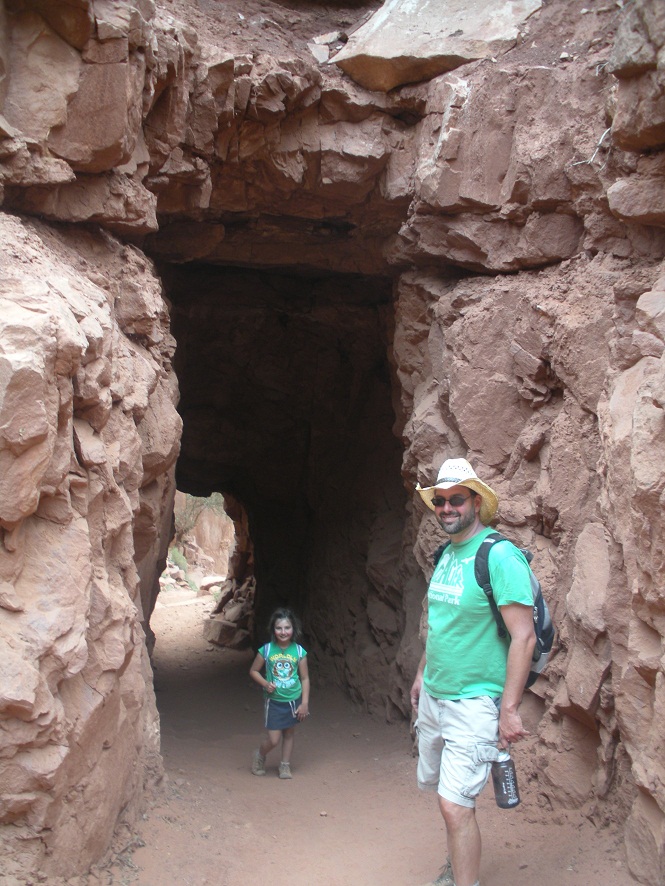 In between hat swaps and pining for the lodge we also spent some time exploring the canyon. Specifically we chose the Kaibab Trail. Although the views were awesome, the hike was not my favorite. Dropping 1400’ in 1.7 miles, the hike was almost entirely made up of switchbacks (I prefer the more gradual up and down involved with climbing a mountain). Going down was easy and exciting as each turn around the bend showed a new angle of the canyon. Going up, however, was a lot less fun and involved a lot of breaks. Adding to the mystique of the trail was the frequent burro trains passing us (and kicking up a lot of dust in the process) as well as their droppings which seemed to be constantly under foot. The trail itself wanders into the bottom of the canyon and then up the south rim (the Colorado River was a measly 14 miles from the top) and attracted everyone from families (us) to serious backpackers planning on exiting the canyon on the south side (3-4 days is typical for that trip).