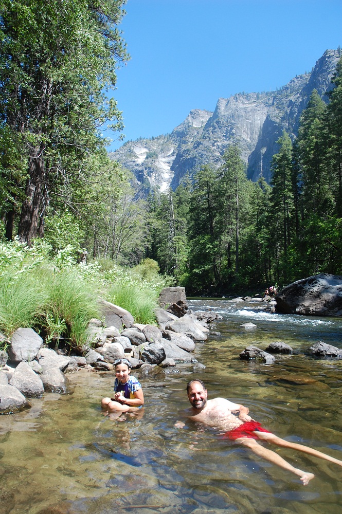 Two nights down and the bears have not bothered us yet. Last night had a much happier vibe to it. After calling my mom and scaring her about the bears (“Get out now! Just find a motel or something and leave! Promise me you will do that!”) we returned to our campground after a fun day exploring the park. Quick impression: Yosemite has it all. You want Sequoia groves? They got it in bunches. A highlight of the day was definitely our stroll through Tuolumne Grove (reached by a short one mile walk). High mountain country where you need a good jacket at night? It dropped to the low 40s last night. A warm valley with majestic and unbelievable rock formations as well as rivers meant to swim in? Well, that is what the park is known for as El Capitan and Half Dome are as pretty as you think they are. Also, head to the Merced River and pull out by the side of the road and jump in. And crowds too! The Valley is like a park within the park; the kind of park that every person in your town feels the need to go to at one time. With trails of asphalt and bikes whizzing past your ear you can, if you are lucky enough to get a parking spot, stroll the Village for ice cream and Ansel Adams prints at the “gallery” (and by gallery they mean print shop).