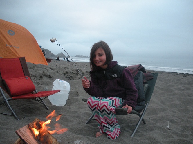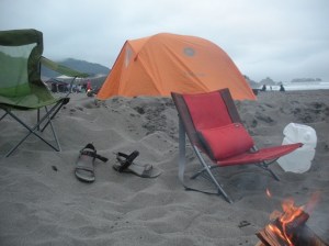 It was a fitting end to our journey up the coast. It was my favorite and least favorite campground of the trip. It was dirty, disorganized and a free for all. Music blared all night and, mixed in among the usual types (older RVers, European travelers, and families seeing the country) where locals looking to party. But, for $5 extra, you could camp on the beach. The surf proved louder than the party goers and the sand made for an excellent bed. We had space, privacy (and it was the darkest night of the trip), a good fire, and one of the few remaining picnic tables. The tables were rare because a few nights ago men came in the middle of the night and stole them right off the beach (this was probably a prank as the tables were found at a nearby beach- the owners had not bothered to pick them up yet). Before sun set Henna and I explored the beach and she twirled to her hearts content (and lost most of the glass she had picked up earlier). It never actually rained, but all night the mist came from the sea and soaked everything. And Corey and I laughed while sipping expensive wine.