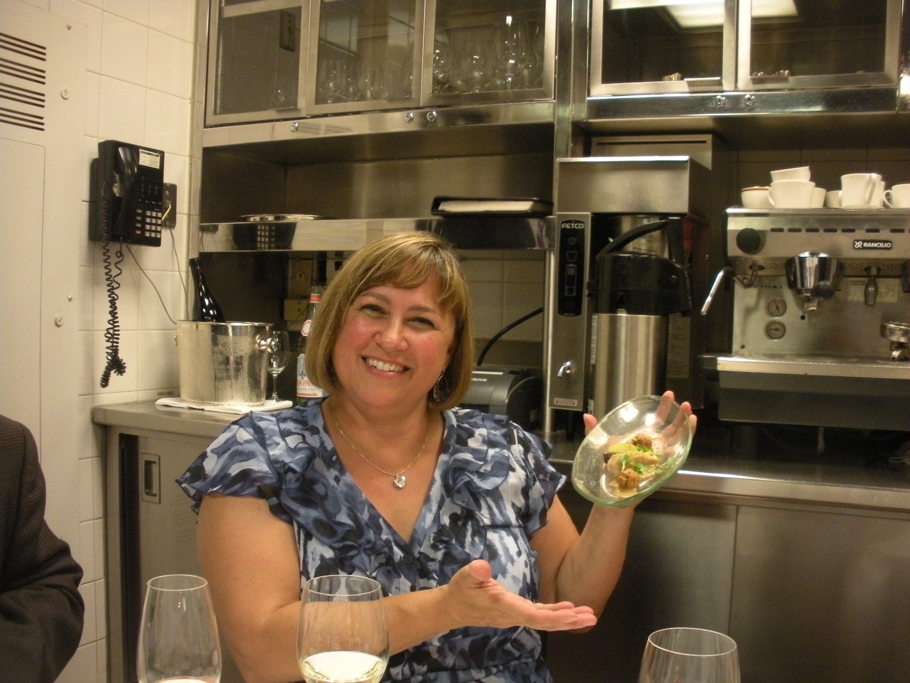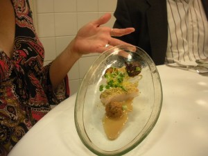 Toward the end of the meal Chef Charlie showed up. This arrival was announced by him berating our nice waiter (he did not raise his voice but our waiter’s body language was one of defeat) and the calm kitchen suddenly appeared a little more stressed. He then came to our table and asked, “Forgive me, but how many times have you dined with us?” When told this was our first time he asked where we were from and then, when told Chicago, he called the males at the table “goumbas” for not taking our dates there sooner. I suggested he put his place on Groupon which resulted in laughs from everyone but him. As he walked away I asked him about his work with Chicago Public School students. My mistake was in how I asked (“I understand that once a week you allow high school students to tour your kitchen.”) His response was an over the top, “No, that is not what I do. (an exaggerated look down) Do you want to know why? (another exaggerated look down- I actually responded with a distinct “no” but he was not actually talking to me, he was speechifying). [chef’s name] come over here. (the chef dropped what she was doing and came over). Do I just give high school students a tour of the kitchen once a week?” (the chef nervously said “no”). Three times a week, fifty weeks a year, I cook for CPS students…. (he then proceeded to describe in detail his program which includes having students ask questions about the food and general discussions concerning “excellency.” When I told him how cool his program was he agreed and said, repeatedly, it was “unheard of (this level of generosity on his part).” He also, after softly giving another command to our waiter, leaned over the table and said “I do not know who I hate more, my employes or the customers.”