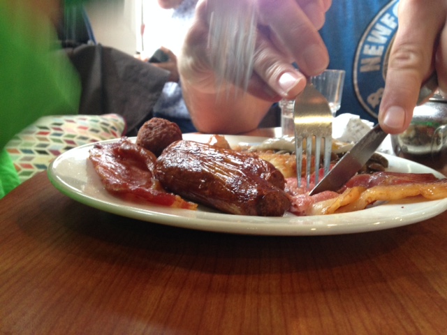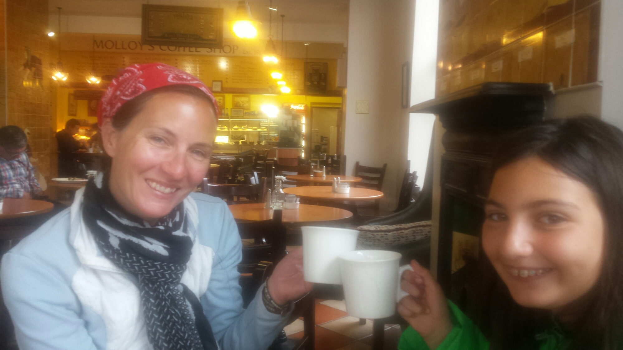 The thing about Ireland is that even on its most weather dreary day there is always somewhere warm and dry to have a breakfast, coffee, or a drink. This morning it was Molloy’s where Henna and I split a traditional Irish breakfast; an egg, rashers (meaty bacon), baked beans, white pudding (similar to kishke if you happen to know what that is), mushrooms, home made brown bread and sausage. Corey had a white coffee (a creamier cappucino) and Henna was served tea with an extra pot of water and a dainty cream holder. Corey also had a homemade scone. It was all less than $18.