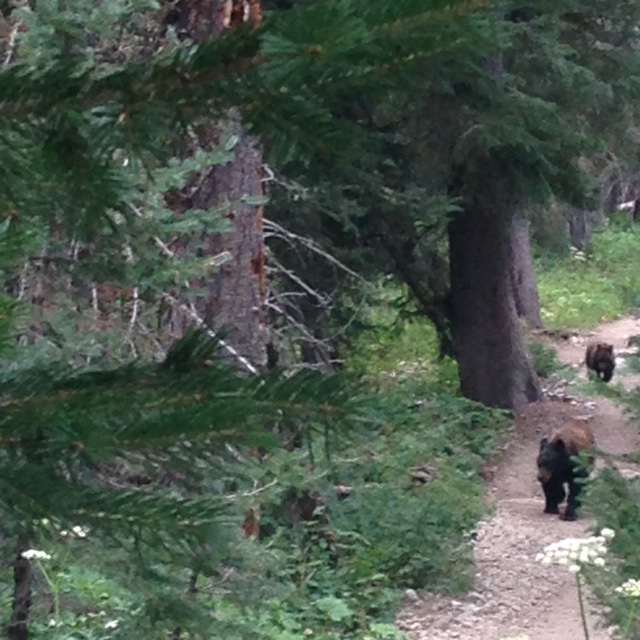 Two park rangers drove a team of mules down the trail which pushed a mama bear and her two cubs down the same trail. This in turn caused several hikers to backtrack to a little pull out we had just reached. Courage though ran uphill with David and Mariah’s enthusiasm making the three of us more confident which in turn calmed a very nervous family standing next to us. The bears passed by less than ten yards from us and it was awesome.