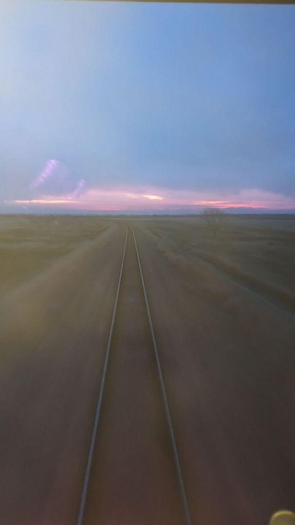 Yes we both had beds. Tiny firm mattresses; mine was at floor level but Corey’s was suspended high above with a kind of seat belt to keep her from falling to the ground. The seat belt was a good idea as the train rocked and rolled across the high plains with a triumphant and incredibly loud horn blaring away every few seconds. We slept better than we did when we were in coach. But not so well that we feel rested.
