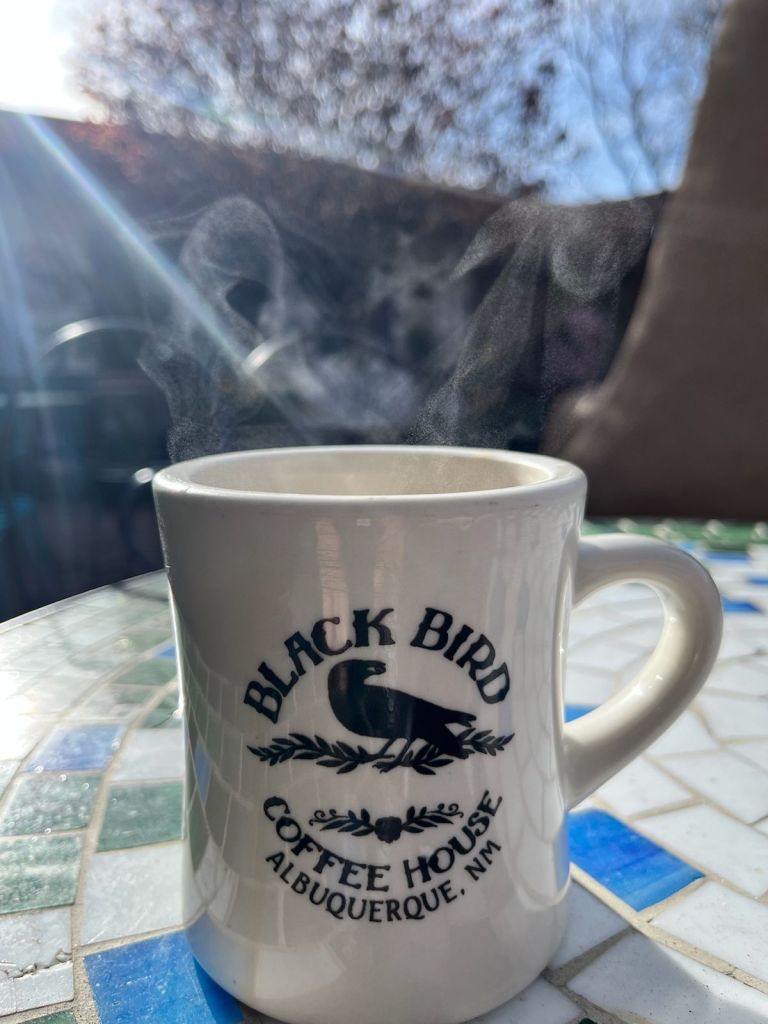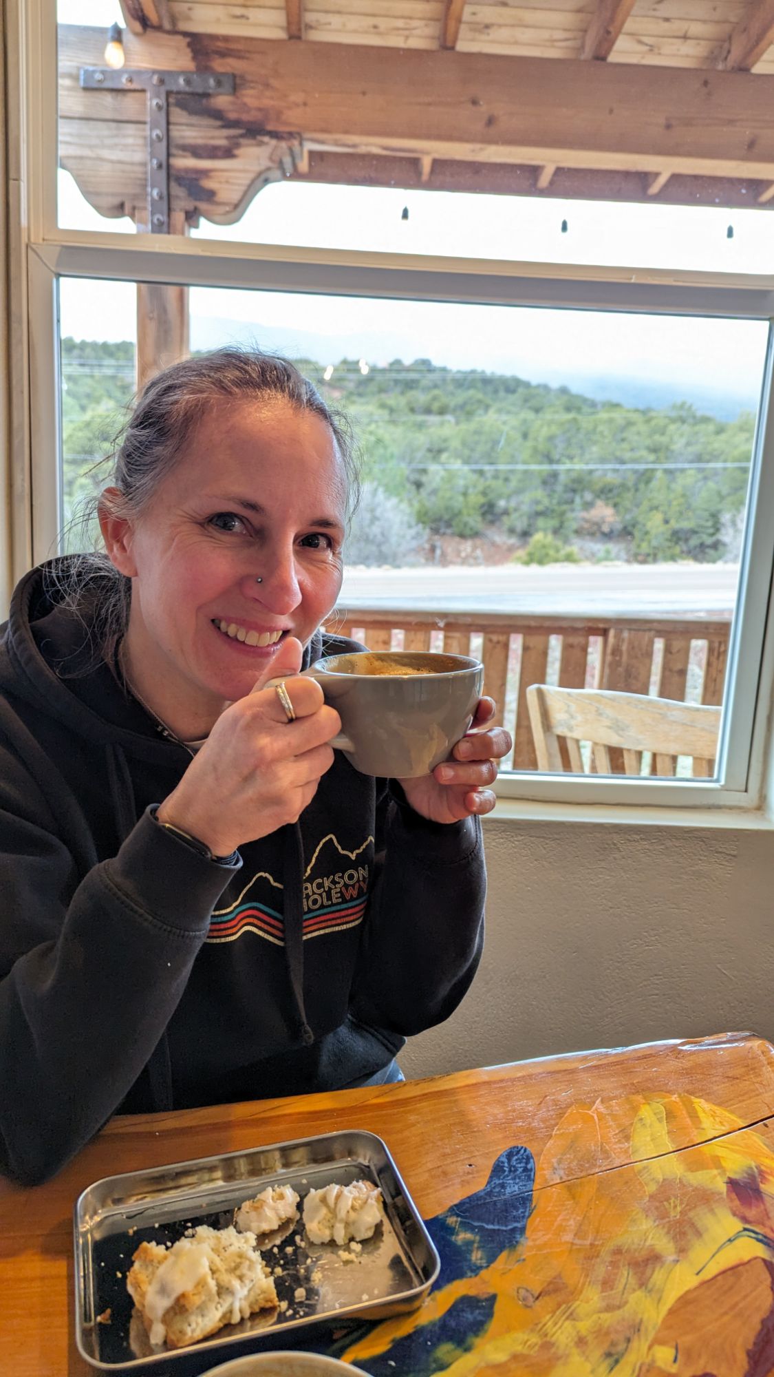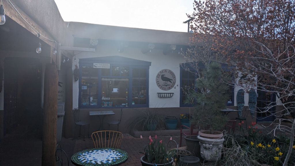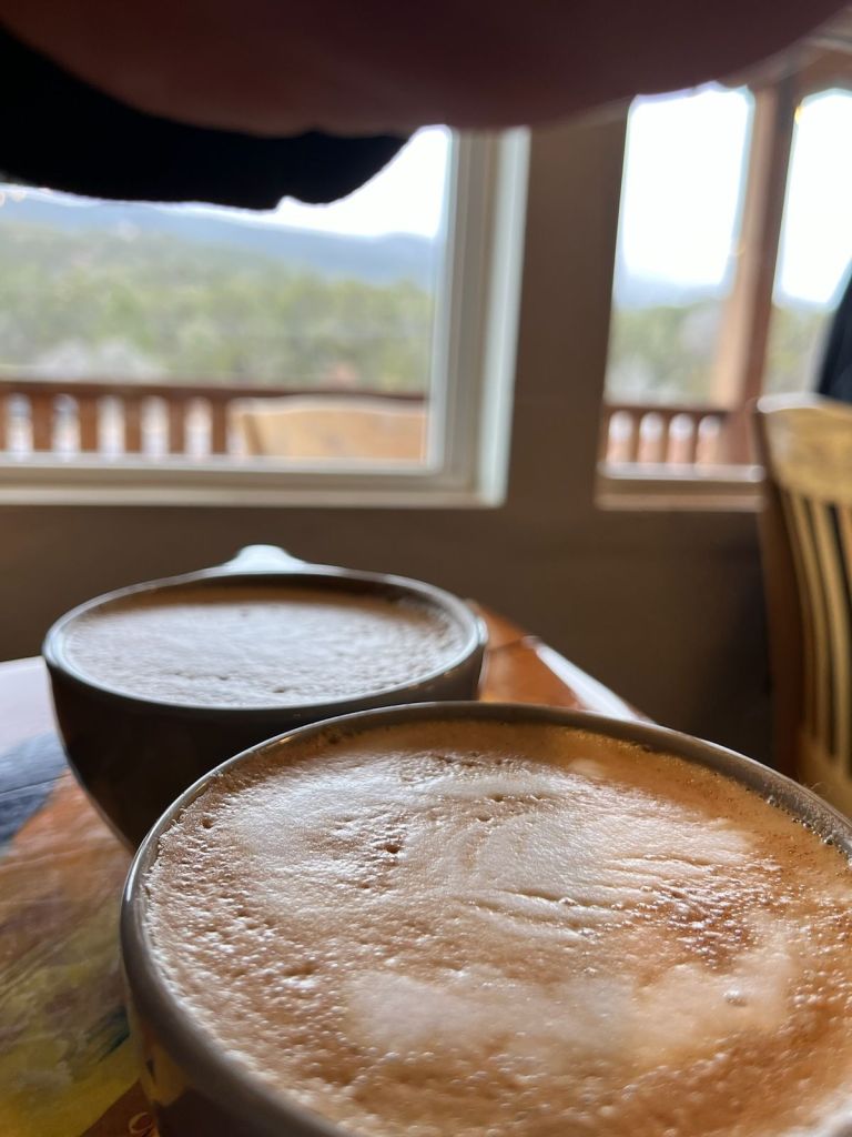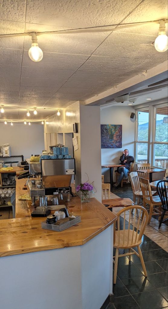 Lunched at a quaint little local eatery called Jimmy Johns. If you ever find yourself there I highly recommend the roast beef sandwich paired with vinegar chips. Afterwards Corey and I took the scenic route into Santa Fe which involved us repeatedly getting on and off the interstate before Google maps realized we were serious about adding an extra ten minutes to our travel. Somewhere within that process white styrofoam (maybe snow?) began pelting our car. Eventually we hit the Turquoise Trail and then almost immediately came across Cabra Coffee.